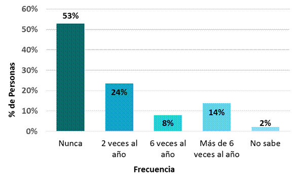 Uno de los enfoques de la encuesta fue determinar la frecuencia con que las personas adquirían enfermedades relacionadas con el mal manejo de aguas residuales, entre ellas la diarrea, el dengue, la hepatitis y otras (WHO, 2017). A partir de la frecuencia, se estableció una posible relación con el tipo de sistema de saneamiento que estaba siendo empleado. Como muestra la Figura 3, un 53% de las personas encuestadas indicó que durante el último año no se había enfermado en su hogar, mientras que para un 24% la frecuencia con la que se enfermaba era de aproximadamente dos veces al año y para un 22% la frecuencia era de seis veces al año o más, quienes además mencionaron que sucedía principalmente en niñas y niños.