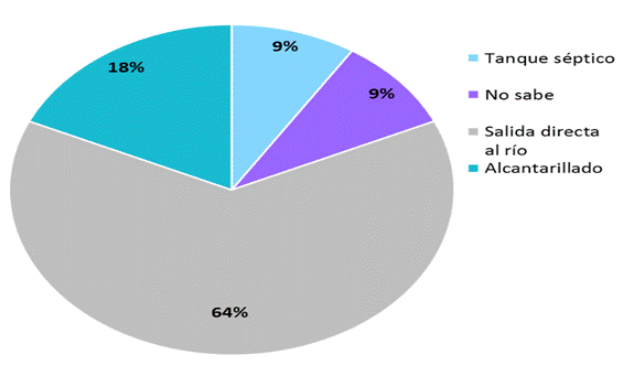 Como se observa en la Tabla 2, al consultar a las personas si las aguas grises y pardas estaban siendo dispuestas en el mismo sitio para su tratamiento, se obtuvo que el 47% tenía la misma conexión para ambas, el 45% las disponía en lugares distintos y el 8% no sabía qué sucedía con ellas. Respecto al manejo de las aguas pardas, el 43% lo realizaba mediante tanque séptico; un 33% la disponía a cielo abierto, ya sea en la calle, acequia, lotes o el río; un 14% iba al alcantarillado y un 10% dijo desconocerlo. Por otra parte, al preguntar sobre el destino de las aguas grises, se obtuvo que un 47% las vertía a cielo abierto, un 27% eran evacuadas mediante alcantarillado, un 16% se disponían en tanques sépticos y el restante 10% mencionó no saber.