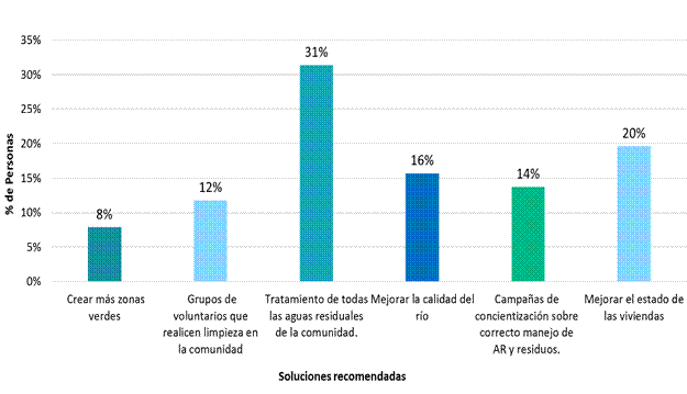 Adicionalmente, la Figura 6 muestra una serie de soluciones que fueron propuestas para enfrentar las distintas problemáticas de la comunidad y el grado de prioridad que se le asignó a cada una. Se obtuvo que el 31% de las personas encuestadas consideró como prioritario el tratamiento de aguas residuales, siendo lo primero en lo que se debería intervenir por parte de alguna institución pública. Seguidamente, un 20% coincidió en que se debería arreglar con urgencia el estado de las viviendas. Como última alternativa quedó la creación de zonas verdes para el esparcimiento, la cual es prioritaria solo para un 8% de las personas.