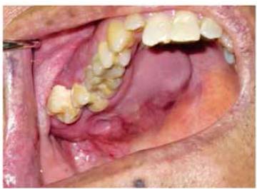 Figura 2 Fotografía intrabucal que muestra la extensión de la lesión. Nótese marcada en la mucosa la cara oclusal de la tercera molar inferior derecha.