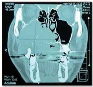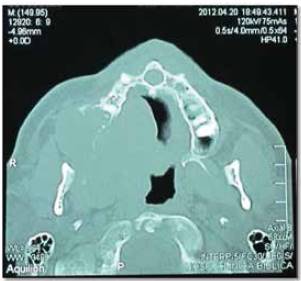 Se realiza un estudio imagenológico por medio de una tomografía computadorizada. Los resultados confirman una lesión de gran tamaño de alrededor de 6,1 x 5,8 centímetros de extensión. El corte coronal muestra comprometida parte del hueso palatino y maxilar, y se observa la completa obliteración del seno maxilar derecho y adelgazamiento de sus tablas corticales (compárese con el seno maxilar izquierdo). La lesión se extiende hasta el piso de la órbita ocular derecha, también invade la región nasal, y afecta los cornetes medio e inferior derechos y supera la línea media nasal (figura 3). El corte axial hace evidente la expansión, adelgazamiento y perforación de la tabla cortical vestibular del cuadrante derecho, así como la expansión de la lesión hacia la línea media del paciente, lo que compromete y obstruye de forma parcial la vía aérea superior (figura 4).
