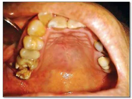 Durante la inspección intrabucal, la lesión se encontró firme a la palpación, indolora y en gran parte de la mucosa se observa de color rosa pálido, otras zonas presentan telangiectasia, irritación y leve inflamación (figura 2). Las piezas molares del cuadrante superior derecho, particularmente la tercera molar, han sido desplazadas hacia vestibular por el crecimiento de la lesión. La mucosa retromolar presenta marcada en su superficie la cara oclusal de la tercera molar inferior derecha, debido a que esta ocluye contra la mucosa, tanto por el tamaño de la lesión como por el desplazamiento que ha ejercido sobre las piezas dentales superiores.