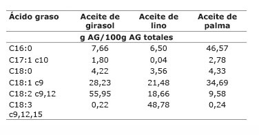 A las dietas se les adicionaron tres aceites comerciales: palma, girasol y lino ( Cuadro 1 ), utilizando dos niveles correspondientes al 2 (10 mg de aceite/500 mg de sustrato) y 4% (20 mg de aceite/500 mg de sustrato) de la dieta en base seca.
