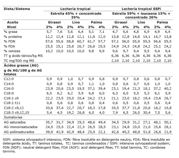 Cuadro 2 Composición nutricional y perfil de ácidos grasos de las dietas representativas de los sistemas lechería tropical, con adición de diferentes aceites a nivel del 2% y 4% de la MS utilizadas en la evaluación in vitro antes de la incubación por veinticuatro horas. Medellín, Colombia. Agosto, 2013.Table 2. Nutritional composition and fatty acid profile of the representative diets of tropical dairy systems with different oil addition to level of 2% and 4% of the DM used in the in vitro evaluation before incubation for twenty four hours. Medellin, Colombia. August, 2013.