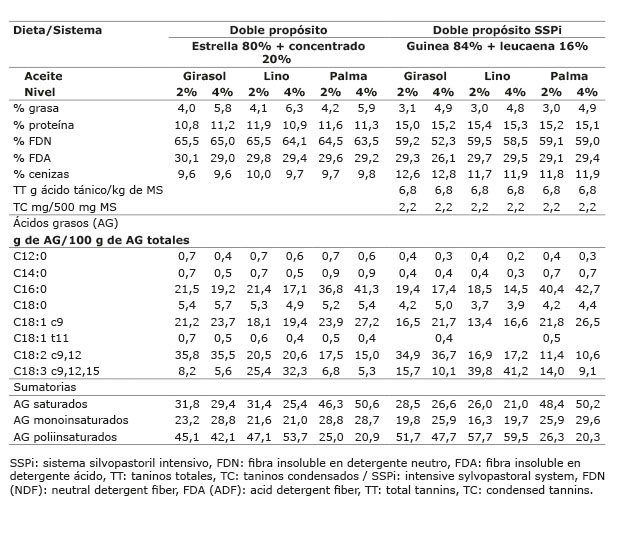 Cuadro 3 Composición nutricional y perfil de ácidos grasos de las dietas representativas de los sistemas doble propósito, con adición de diferentes aceites a nivel del 2% y 4% de la MS utilizadas en la evaluación in vitro antes de la incubación por veinticuatro horas. Medellín, Colombia. Agosto, 2013. Table 3. Nutritional composition and fatty acid profile of the representative diets of dual-purpose systems with different oil addition to level of 2% and 4% of the DM used in the in vitro evaluation before incubation for twenty four hours. Medellin, Colombia. August, 2013.