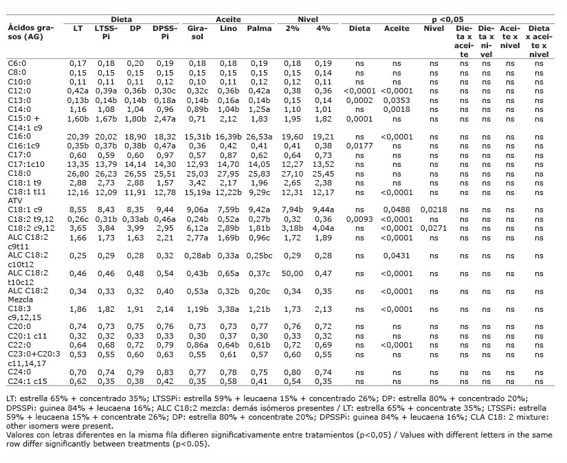 No hubo efecto de las interacciones entre dieta, fuente de aceite y nivel de aceite (p>0,05) sobre los AG evaluados. Lo anterior muestra una respuesta independiente y clara de las diferentes fuentes de aceite y el nivel de inclusión sobre los AG evaluados.