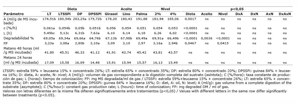 Cuadro 5 Cinética de fermentación y producción de metano producto de la fermentación in vitro de las dietas con adición de diferentes aceites a nivel del 2% y 4% de la MS. Medellín, Colombia. Agosto, 2013.Table 5. Kinetics of fermentation and methane production produced by in vitro fermentation of diets with different oil addition to level of 2% and 4% of the DM. Medellin, Colombia. August, 2013.