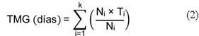 Donde, TMG = tiempo medio de germinación en días; Ni = número de semillas germinadas en un día; Ti = tiempo transcurrido (en días) desde el inicio del experimento hasta la i-ésima observación, y k = último día de germinación.