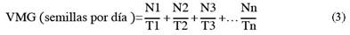 Donde, N1, N2, N3… Nn = número de semillas germinadas por día; T1, T2, T3, … Tn = tiempo después de la siembra.
