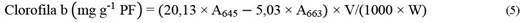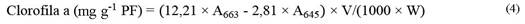 Donde V = volumen en mL de acetona al 80 % y PF = peso fresco de hojas cotiledonares en gramos.