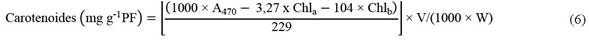 El contenido de pigmentos fotosintéticos fue determinado 15 dds según la metodología de Lichtenthaler y Wellburn (1983). Se tomaron 0,1 g de hojas cotiledonares frescas, a las cuales se les añadieron 4 mL de acetona al 80 % (v/v). La mezcla se trituró y se centrifugó a 3000 rpm por 5 min. La absorbancia del sobrenadante fue medida a 663, 470 y 645 nm usando un espectrofotómetro UV. Los cálculos de las concentraciones de pigmentos se determinaron con las ecuaciones 4, 5 y 6.