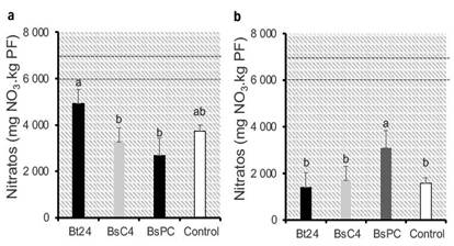 En el caso del kale, el contenido de nitratos tuvo un incremento significativo con el tratamiento BsPC, alcanzando un promedio de 3088 mg NO3/kg de PF. Este valor representa un aumento del 138,3 % en comparación con el control, cuyo contenido fue de 1569 mg NO3/kg de PF. Los tratamientos Bt24 y BsC4 no mostraron diferencias estadísticas significativas respecto al control, con un promedio de 1544 mg NO3/kg de PF (Figura 1b).