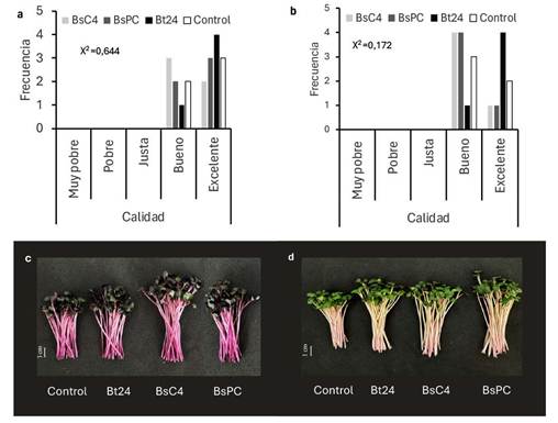 La distribución de las observaciones para los microvegetales de kale se concentró en las categorías “Bueno” y “Excelente”, con nulas frecuencias en las categorías de menor calidad (Figura 2b). El análisis de Chi-cuadrado resultó en un estadístico de X2 = 0,172, lo que indicó la ausencia de diferencias significativas entre los tratamientos bacterianos (p < 0,05). Las frecuencias observadas en los tratamientos Bt24 y el control presentaron una mayor frecuencia de microvegetales clasificados en la categoría “Excelente”, mientras que BsC4 y BsPC mostraron una distribución más homogénea entre las categorías “Bueno” y “Excelente”. Sin embargo, las diferencias numéricas no alcanzaron significancia estadística, como se representa en la Figura 2d.