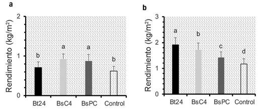 En kale, el tratamiento Bt24 registró el mejor rendimiento, con un promedio de 1,90 kg/m2, lo que representó un incremento del 62,60 % en comparación con el control. BsC4 alcanzó un rendimiento de 1,72 kg/m2, equivalente a un aumento del 46,42 %. Finalmente, en el tratamiento BsPC se observó una mejora del 21,37 % en el rendimiento, con un promedio de 1,42 kg/m2 (Figura 3b).