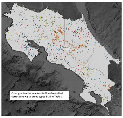A total of 1,412 purebred and crossbred animals from 744 herds across Costa Rica were randomly sampled for tail hair follicles by 25 field technicians. The samples were sent to the Laboratorio de Bioseguridad (Biosafety Laboratory, SENASA) for DNA extraction and genotyping of 18 microsatellite markers. The specific details of the sampling procedure can be found in Cordero-Solórzano et al. (2015). To keep inbreeding low, the number of herds to be sampled was maximized, and samples were restricted to two animals per herd, unless several breed types were present within the same productive system.