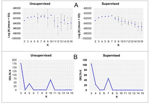 Figure 2 Estimates of Log (K) (mean ± SD) (A) and Delta K criterion (mean(|ln(K)|/sd(ln(K)) (B) obtained from the Structure Harvester procedure for unsupervised and supervised admixture genetic models. Costa Rica, 2015.