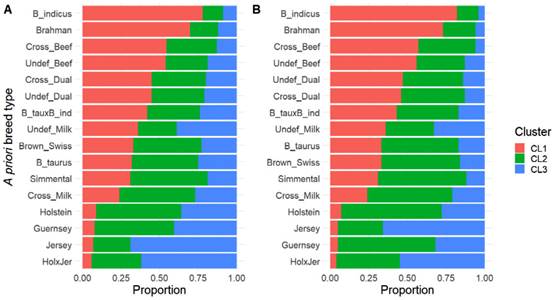The genetic structure of the population when K = 2 is depicted in Figure 3. The results from both approaches (unsupervised and supervised) were similar, generating a first cluster (CL1) that was mostly represented for B. indicus and Brahman breed types, as well as for crossbred or undefined breed types used for beef or dual-purpose. The second cluster (CL2) was mainly composed of dairy breeds, dairy cross breeds, and other minor B. taurus breeds, as well as undefined breed types for dairy purposes.