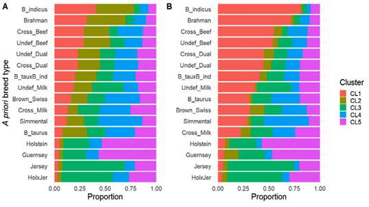 For K = 5, the clustering patterns obtained for the unsupervised and supervised approaches began to differ (Figure 6). An evident difference between clustering patterns in K = 5 was that, in the unsupervised scenario, the main representation for B. indicus, Brahman, beef cross and undefined breeds, as well as dual purpose (cross and undefined) were divided into two clusters (CL1 and CL2) with comparable proportions of individuals, while in the supervised model those classifications remained mostly represented in CL1, with CL2 not showing a large association with any of the breed types. CL3 was associated with Jersey and Holstein×Jersey breed types, CL4 was related to Simmental and Brown Swiss breeds, and CL5 was mostly composed of Holstein and Guernsey breeds.
