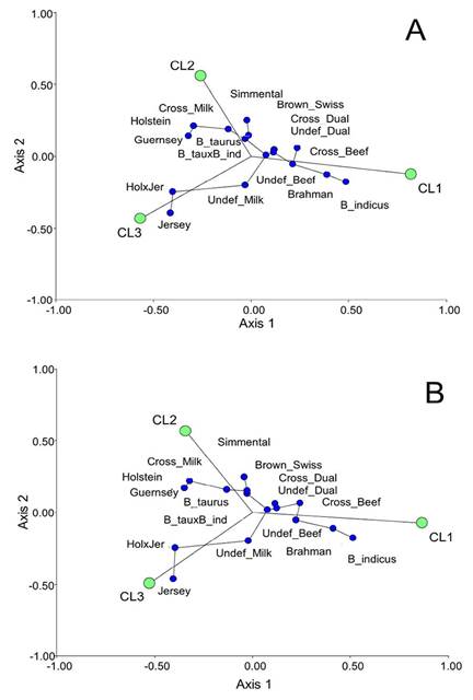 A minimum spanning tree was built to explore the relationships between predefined breeds and clusters in a two-dimensional plane (Figure 7). The results for both scenarios were practically identical. CL1 was located next to beef animals (B_ind, Brahman, Cross_Beef, Undef_Beef and Undef_Dual). CL2 was close to Holstein and Guernsey breeds, dairy cross breeds, Simmental, Brown Swiss and other minor B. taurus breeds, while CL3 was oriented in the same direction as Jersey, Holstein×Jersey and dairy cross breeds.
