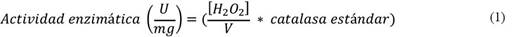 La actividad enzimática de las muestras se determinó según la ecuación 1, donde (H 2 O 2 ) correspondió a la concentración de peróxido de hidrógeno (μmol) y V (mL) al volumen de muestra utilizada. La concentración de la catalasa estándar empleada fue de 1,3 U/mg de proteína.