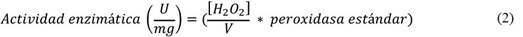 La actividad enzimática de las muestras se determinó según la ecuación 2, donde (H2O2) correspondió a la concentración de peróxido de hidrógeno (μmol) y V (mL) al volumen de muestra utilizada. La concentración de la peroxidasa estándar fue de 0,25 U/mg de proteína.