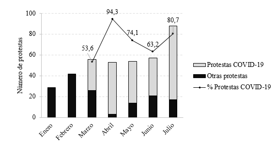 Figura 1 Número de protestas efectuadas en Costa Rica entre enero y julio del 2020, relacionadas y no relacionadas con la COVID-19. La línea continua indica el porcentaje de protestas relacionadas con la COVID-19 en cada mes. Número total de protestas: 379.