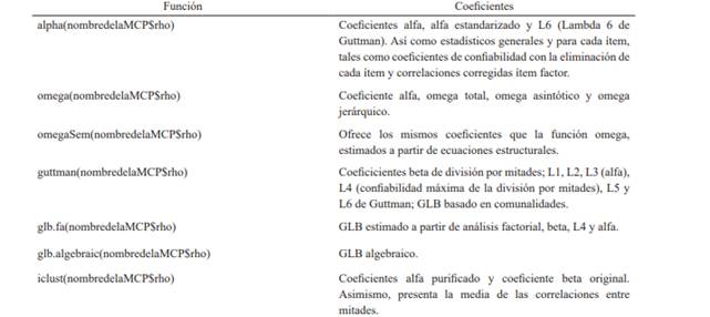 Se pueden seleccionar distintos coeficientes de confiabilidad que pueden ser calculados mediante psych y GPArotation, que se resumen en la tabla 1. Nótese que, luego de insertar el nombre de la MCP, se debe ingresar el comando $rho. Este comando implica que únicamente la matriz se utiliza para los cálculos, independientemente de otra información guardada junto con la matriz (Gadermann et al., 2012).
