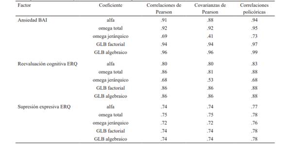 En primer lugar, se examinó la dimensionalidad de los instrumentos al probar el modelo unidimensional del BAI (Vizioli & Pagano, 2020) y el de dos factores independientes del ERQ (Pagano & Vizioli, en prensa; Gross & John, 2003). Como puede observarse, los índices de bondad de ajuste resultaron adecuados en ambos casos (tabla 2).