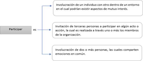 De acuerdo con Montero (2004), buscar una definición de participación es complejo, pues considera muchas connotaciones como la política, comunicacional o económica, por lo que la palabra participación se ve implicada ante diferentes perspectivas. En esta línea, existen tres definiciones generales de la palabra participar (Montero 1996, como es citado en Montero 2004), como se ilustra en la Figura 1.
