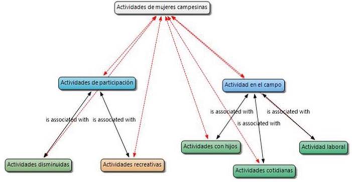 En relación con el segundo objetivo, que identificaba las actividades y experiencias de participación social de mujeres adultas de las comunas de Mulchén y Parral bajo el contexto campesino, se genera la categoría actividades de mujeres campesinas, representada en la Figura 3. En ella se visualiza la subcategoría actividades de participación, en la cual se desprenden las subdimensiones de actividades disminuidas y actividades recreativas asociadas al desarrollo de tareas de costura o participación en la junta de vecinos, las cuales desempeñan hace tiempo y les permiten interactuar con otros actores de la localidad como: