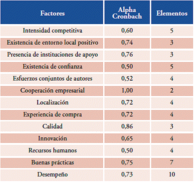 El procedimiento antes explicado arrojó como resultado que el cuestionario auto-administrado posee una fuerte confiabilidad en los siguientes factores: existencia de un entorno local positivo, presencia de instituciones de apoyo, cooperación empresarial, experiencia de compra, calidad, localización, buenas prácticas y desempeño; de igual manera los demás presentan un coeficiente de media confiabilidad pero es aceptable.