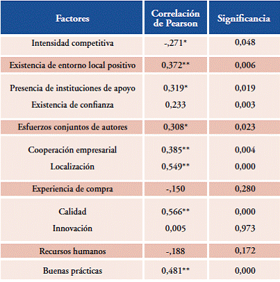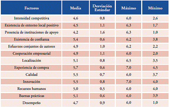 Según los resultados obtenidos, los factores que presentan un promedio medio alto son: experiencia de compra, calidad, innovación, existencia de confianza, localización, buenas prácticas, recurso humano y esfuerzos conjuntos con los autores, así como cooperación empresarial, lo que significa que estos factores son los de mayor incidencia en el desempeño del clúster.