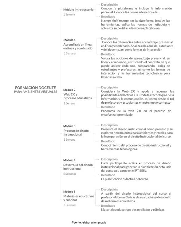 Por otra parte, el diagnóstico en su segunda fase generó un plan de formación para profesores con el objetivo de dar capacitación en el diseño de cursos virtuales, como se aprecia en la imagen 1. Cada módulo cumple un objetivo y un proceso de formación que contribuye a insertar a los participantes en el mundo de la educación virtual a partir de su propia vivencia y a desarrollar productos para sus clases en línea.