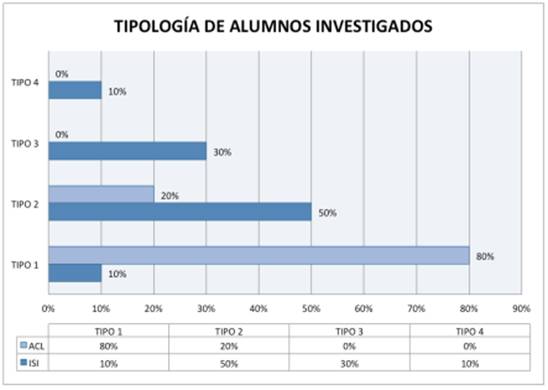 Esta tipología es global y generalizadora para los dos grupos de discentes observados. Pero debe anotarse que en el grupo ACL, el porcentaje de alumnos Tipo 1 fueron los predominantes; en 80% y en 20% los Tipo 2, mientras que los Tipos 3 y 4 no obtuvieron ningún resultado. En el grupo ISI -por su parte- el porcentaje estuvo más repartido entre el resto de tipologías, siendo la predominante los Tipos 2 y 3, dejando en minoría a los Tipos 1 y 4 (véase figura 8).