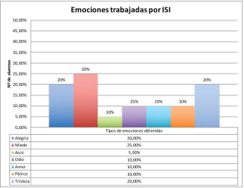 Una vez clasificados los alumnos por su tipología, se deben ofrecer los resultados de las tipologías de emociones que fueron clasificadas por estos en las primeras sesiones tras el visionado de los videoartes. Estas emociones son las que los discentes posteriormente trabajaron en sus propias piezas audiovisuales. De la observación y exposición de los alumnos se consiguió la siguiente clasificación de emociones y el porcentaje de uso en sus trabajos audiovisuales (figuras 9 y 10):