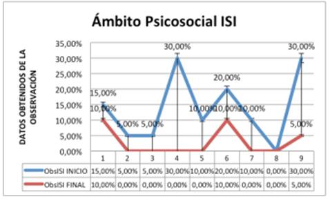 Con respecto al análisis de las mediciones psicosociales, se tiene que anotar que uno de los valores fundamentales del audiovisual es el trabajo en equipo, sin el cual sería imposible la realización de cualquier pieza compleja. Por eso se hizo especial hincapié en este sentido, sobre todo en el grupo ISI, donde se observó en un inicio a dos alumnos con muy baja capacidad de empatía y sentimiento de pertenencia, debido a una situación personal complicada. Durante las semanas siguientes se pudo ver que los alumnos poco a poco entraban en las dinámicas con mayor soltura y entendimiento con el resto de sus compañeros. Así se mostraron grandes mejorías en aspectos como la medición núm. 4, en donde las relaciones entre iguales dentro del grupo mejoraron 30%. Al igual ocurrió con la motivación a la hora de realizar las actividades, donde en 25% se vieron incrementados los estímulos hacia las dinámicas. Más dificultades se encontraron a la hora de mostrar los sentimientos, donde el nivel de mejoría fue más bajo, tan solo de 10%. Al respecto de los estados de ánimo, las mejorías también fueron moderadas, siendo un reflejo común en discentes de estas edades.