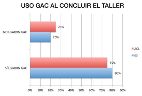 Los resultados de la primera fase de GdO denotaron unos datos esclarecedores con respecto a las carencias de concentración y atención de los alumnos de ISI en contraposición con los de ACL, situación que se invierte cuando se habla de los datos de cuestiones psicomotrices y psicosociales. En relación con las dimensiones cognoscitivas de inicio y final del taller se observa que las capacidades de atención y fatiga se ven reducidas en 30% en los dos casos de estudio, gracias al uso de G.A.C., al igual ocurre con los valores de fatiga y comprensión, en donde los márgenes de mejoría se han visto superados en 20% en los dos casos.