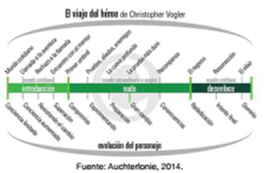La “narratividad” es el pilar fundamental de esta metodología. Por lo tanto, se han tomado los puntos fundamentales de las estructuras audiovisuales para conformar una línea de tiempo, en la que el discente recibirá los conocimientos que los planes de estudios marcan. El planteamiento metodológico-narrativo parte de la estructura narrativa de Vogler (2002) y Campbell (1949), en donde se exponen los doce estadios del viaje del héroe y que están expresados en la siguiente figura (Auchterlonie, 2014).