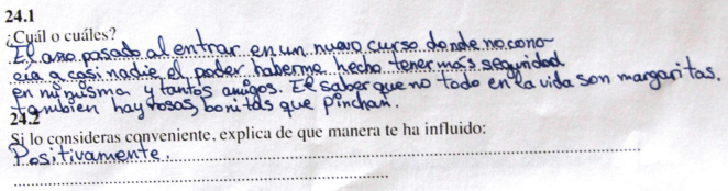 Desde el primer día de clase las emociones forman parte fundamental de todos los contenidos. Se intentan argumentar con historias narradas repletas de alegorías emocionales audiovisuales para introducir la alfabetización audiovisual. De esta manera, los alumnos tendrán vía libre para explicar sus sentimientos sin necesidad de hablar en primera persona, y mostrar estados psicológicos empáticos que ayuden al sentimiento de pertenencia por medio de sus compañeros. Este hecho fue patente en el CF a través de las mediciones CF24.1 y CF24.2, en donde alumnos como ISI02 reflejaron el sentimiento de pertenencia hacia sus compañeros y la satisfacción que ello le produjo (figura 22):