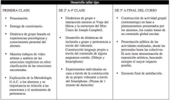 Para el desarrollo del taller, obviamente se sigue el mismo método que se intenta demostrar. En su diseño se tuvieron en cuenta valores positivos de otras metodologías explicadas en el punto 2.1: escogiendo de Flipped Classroom las ventajas del trabajo audiovisual desde casa; de los ABP, realizar microproyectos que aglutinen la materia en diferentes fases; del Aprendizaje Cooperativo la importancia del trabajo en equipo; de la Gamificación, la integración de las estrategias audiovisuales de los videojuegos a la construcción de significación en la narratividad del aula; del Aprendizaje basado en problemas, saber ir resolviendo las preguntas que se van planteando en los estudios; del Design Thinking, la importancia de la innovación en cuanto a la resolución de los conflictos en las dinámicas; del Aprendizaje basado en el pensamiento, la necesidad de enseñar a contextualizar, analizar, relacionar y argumentar, y del Aprendizaje basado en competencias, la adquisición de las habilidades necesarias para superar las competencias que se marcan en los planes.