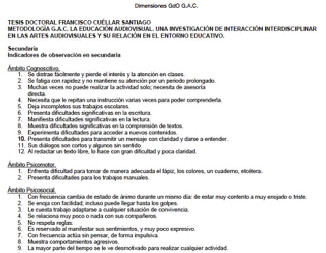 Ahora, el estudio se centrará en explicar el análisis cualitativo que se ha elaborado con la Guía de Observación (GdO), llevada a cabo a lo largo de los seis meses de taller, tanto del ISI como de ACL. La GdO evalúa al alumno desde tres ángulos diferenciados: a) exposición en el encerado del aula de su metodología G.A.C. desarrollada a través del contenido de la materia elegida, b) la participación en clase a lo largo del taller y la realización de las dinámicas planteadas por el docente y c) exposición y explicación del videoarte realizado. Los datos fueron recogidos gracias a la observación directa, utilizando unos ítems preestablecidos en una tabla, creada a partir de la Guía de Observación para la Detección de Necesidades Educativas propuesta por el Consejo Nacional de Fomento Educativo de México (Pública, 2010) y que fue adaptada para los discentes españoles. Dicha guía adaptada constaba de las siguientes dimensiones: