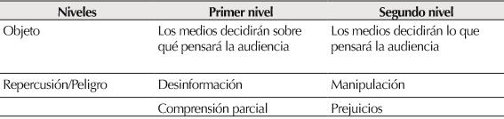 En los años setenta del siglo XX, se desarrolla la teoría de la agenda setting que estudia la repercusión de la información proporcionada por los medios de comunicación en la opinión pública (McCombs, 1992, 1994, 1996, 2006). Se podría decir que, según este postulado, aquello que los medios consideran más relevante para su agenda será lo más relevante para la opinión pública. Según McCombs (1994), se desarrolla en dos niveles, tal como aparece en la tabla 1, que se muestra a continuación: