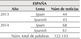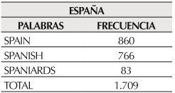 En primer lugar, es indispensable dar cuenta de la frecuencia de los lemas específicos para la extracción automática, es decir, la unidad autónoma y semántica que constituye parte del léxico de este corpus. La siguiente tabla muestra la frecuencia de los lemas referidos a España en el corpus:
