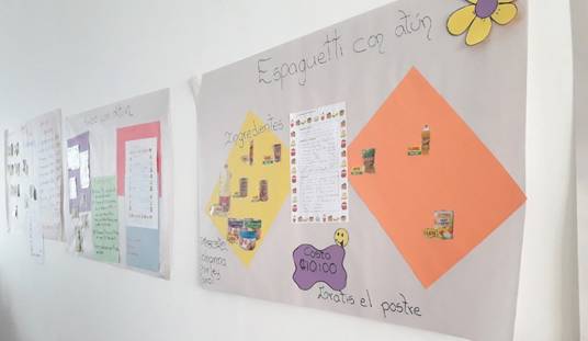 Para el desarrollo de esta etapa, se forman grupos de trabajo de dos o tres integrantes y se les solicita formular una receta para preparar un almuerzo que integre productos que se contemplan en el material informativo entregado: anuncios de periódico o catálogos publicitarios de supermercados. El tiempo destinado a la actividad es de 40 minutos.