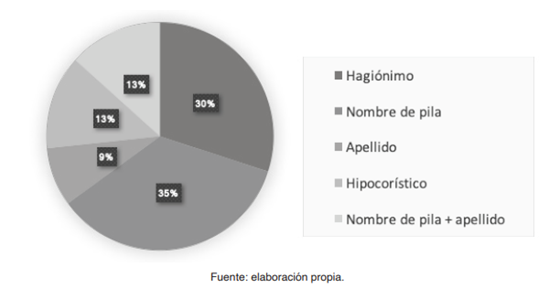 En cuanto a la clase de nombre predominante, sobresalen los nombres de pila (9 con denotatum conocido y 12 desconocidos), en tanto los menos frecuentes son los apellidos (5). En la figura 1, se presenta la distribución de las UF según el tipo de nombre que aparece: