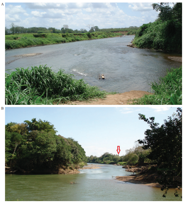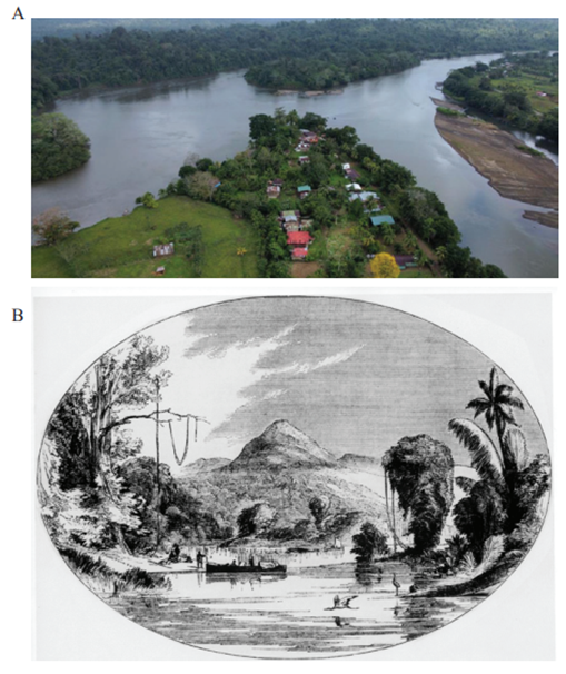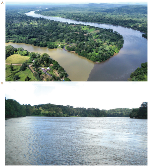 Figura 3 Boca del río San Carlos (a la derecha), con el islote Providencia hacia el centro (A), así como la confluencia de los ríos San Carlos y San Juan (B).