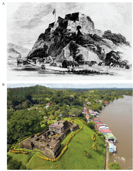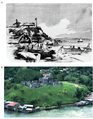 En cuanto al citado islote, denominado isla San Carlos por von Bülow, en realidad correspondía a la isla Providencia o Petrona (Figura 3A). Por cierto, se cuenta con una imagen de ese punto geográfico, trazada en aquella época (Figura 3B), aunque un poco confusa, debido a algunas licencias artísticas del dibujante, en particular en relación con la localización y la fisonomía del cerro San Carlos; esas discordancias aparecen discutidas en Hilje (2014), aunque no hay duda de que el islote es el que está en el centro y al fondo de la imagen.