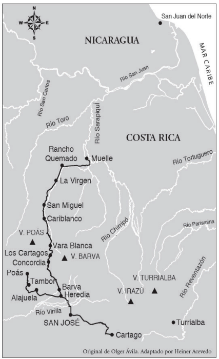 Con ello, el ejército filibustero se garantizó el dominio pleno del río San Juan, pues ya tenían en sus manos San Juan del Norte, y las fortificaciones del Castillo Viejo y el fuerte de San Carlos, este último en la conjunción del río y el lago de Nicaragua. Es pertinente señalar que estas fortalezas fueron construidas por la Corona Española desde la época de la colonia, entre 1666 y 1680, para defenderse de los ataques de los piratas ingleses; fue en el Castillo Viejo donde, en 1781, el célebre almirante Horatio Nelson -héroe de la batalla de Trafalgar- ganó un importante combate contra las fuerzas españolas. Para retornar al acto de Baldwin, este fue un hecho grave para nuestro país, pues de Europa se recibía correspondencia sensible, alusiva a la guerra que ya se había declarado a Walker. Por ejemplo, entre otras cosas, el secretario personal de don Juanito, el francés Adolphe Marie, había estado en su país, realizando gestiones para reclutar al experimentado militar Pedro Barillier -pues había peleado en la ya citada guerra de Crimea-, quien había arribado al país el 14 de marzo, cuando nuestro ejército ya marchaba hacia Guanacaste. Y, por si no bastara con esta afrenta, esa misma semana corrió el rumor de que habría una incursión del ejército filibustero por el río Sarapiquí, para avanzar por la trocha de montaña que se prolongaba hasta el Valle Central, y así atacar las ciudades de Alajuela y Heredia.