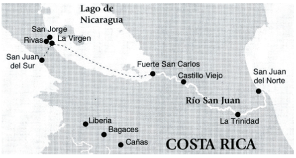 Mientras esto ocurría en el mar Pacífico, ya se había puesto en operación la segunda fase de la estrategia: la toma del río San Juan, es decir, los tres sitios ribereños donde había guarniciones filibusteras (La Trinidad, el Castillo Viejo y el fuerte de San Carlos), más un ataque relámpago al neurálgico puerto de San Juan del Norte, en el Caribe (Figura 7).