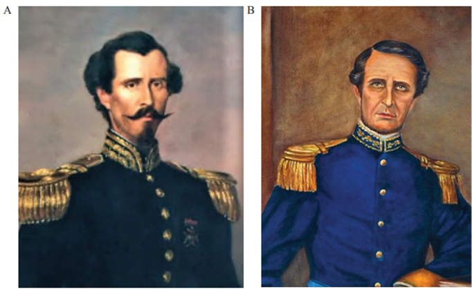 Como el tiempo apremiaba, sin conocer lo ocurrido a Alvarado y su séquito, el 3 de diciembre había partido de la capital la vanguardia de nuestro ejército, de unos 200 hombres, al mando del sargento mayor Máximo Blanco Rodríguez (Figura 8A), mientras que la retaguardia, de 500 hombres, saldría el día 15, liderada por el ya citado general José Joaquín Mora (Figura 8B). Aunque, como se verá después, Blanco fue el líder de las operaciones en el río San Juan, él consigna en el detallado diario que escribió (Korte, 2017), que inicialmente el jefe era el teniente coronel francés Pedro Barillier; a éste se le conocía como el Zuavo, por el tipo de traje que solía usar -con pantalones muy holgados, o bombachos-, a la usanza de los soldados argelinos que integraron el ejército francés a partir de 1830.